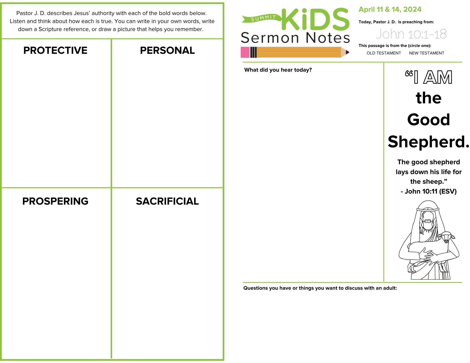 Without shepherds to care for them, the threats posed to sheep run the gamut, from losing their way to being attacked by other animals. Simply put, sheep thrive under the guidance and protection of their shepherd. In this week's message from John 10, Pastor J.D. takes us through Jesus' claim to be the "good shepherd." What is so remarkable about this shepherd is that his love for the flock leads him to not only protect them, but lay down his life for them. As believers, then, we can fix our eyes not on any dangers that may threaten to harm us, but on our good shepherd.