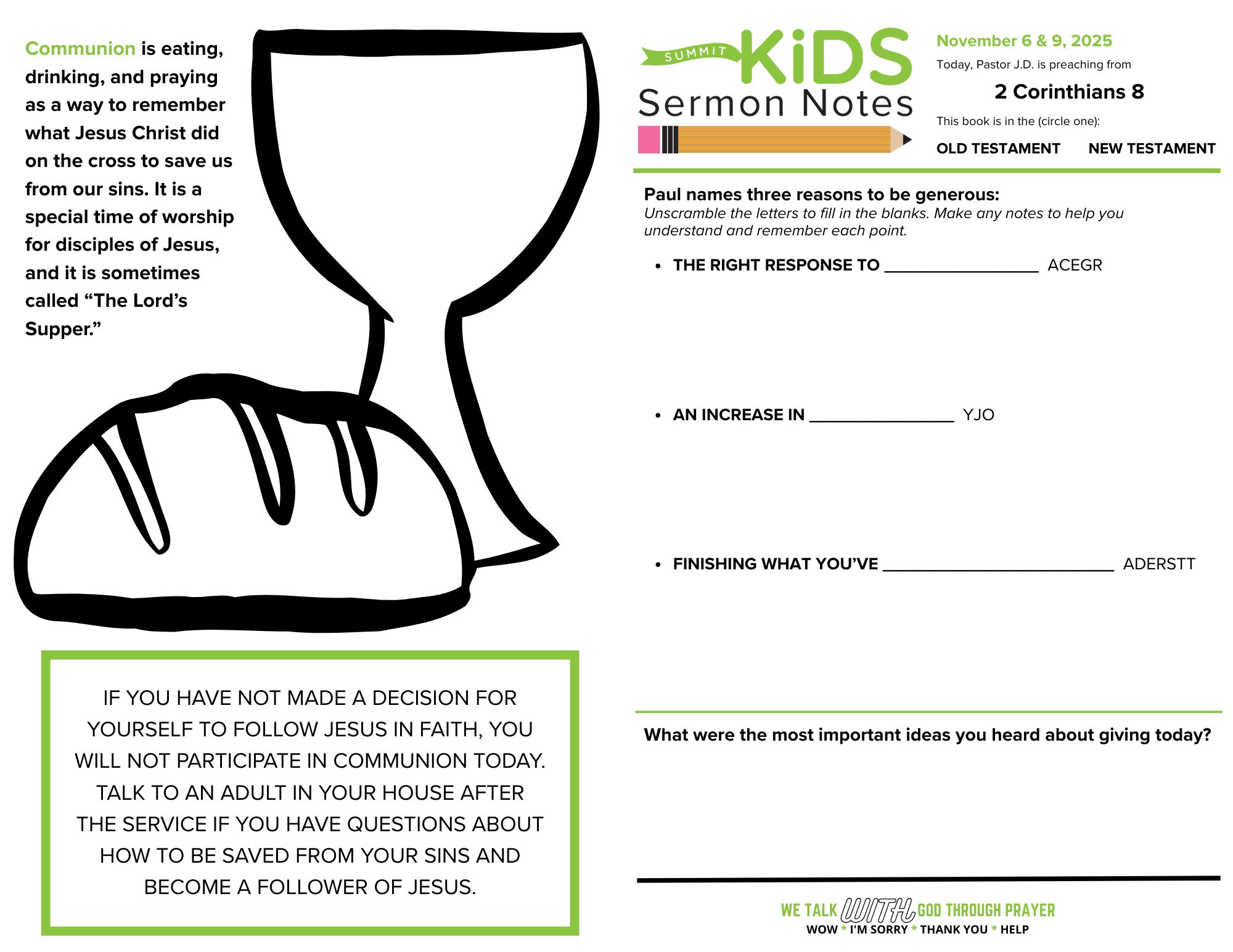 Let’s face it: It’s hard to talk about money. But what if we reoriented our perspective on it? In fact, what if we reoriented our entire lives in response to the grace that God has shown us? In this week’s message from 2 Corinthians 8, Pastor J.D. explains the Apostle Paul’s reasons for wanting the Corinthian church to be generous, as well as some obstacles that often sabotage good intentions. We have such a kind, generous God, and in the end, the only right response is for our own generosity to overflow to those around us.