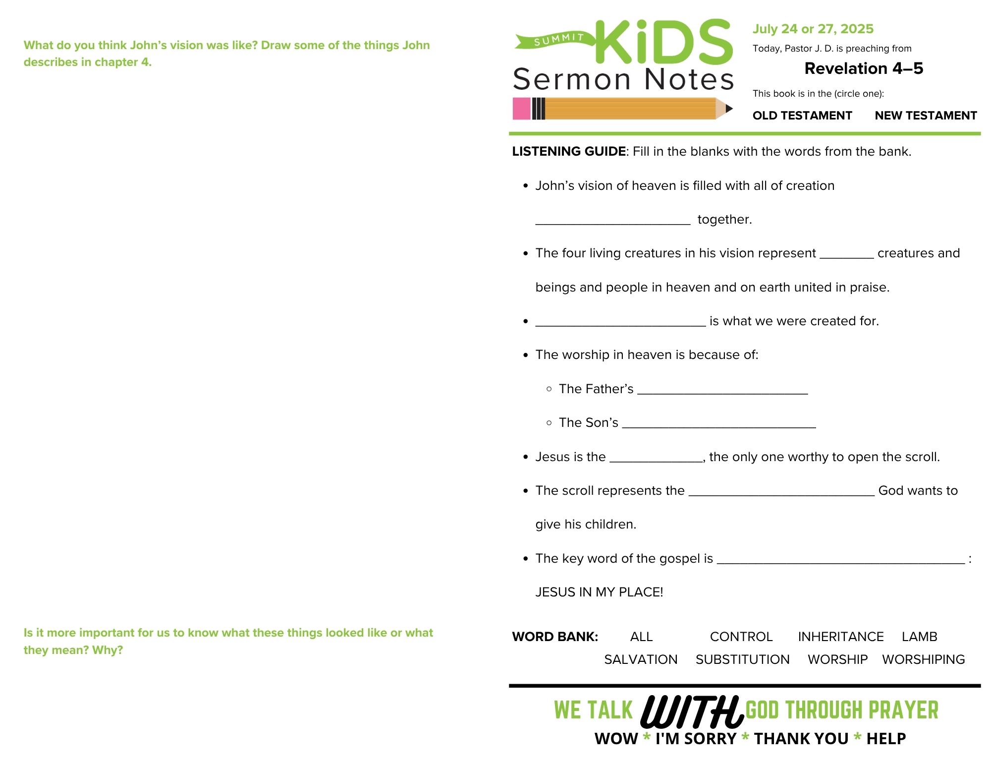 We were created to worship. Even those who claim no interest in religion will inevitably worship something, whether it's fame, wealth, family, or another thing entirely. In this week's message from Revelation 4–5, Pastor J.D. gives us a glimpse of heavenly worship that is motivated by the sovereignty of God and the salvation found in Jesus. This Jesus, the Lion and the Lamb, is the one our hearts yearn for and the only one who can give us life to the full.